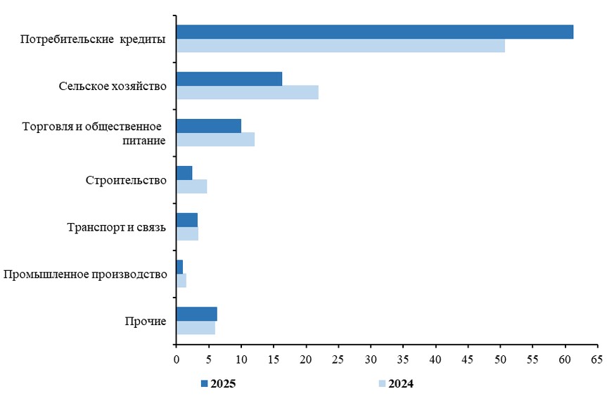 Больше всего микрокредитов выдали в Бишкеке (27,5 процента от общего объема), Ошской (16 процентов), Джалал-Абадской (14 процентов) и Чуйской (более 13 процентов) областей.Из общего объема выданных в I полугодии микрокредитов более 60 процентов взяли на потребительские нужды, более 16 процентов пошли на развитие бизнеса в сельском хозяйстве, около 10 процентов — на сферу торговли и общественного питания.