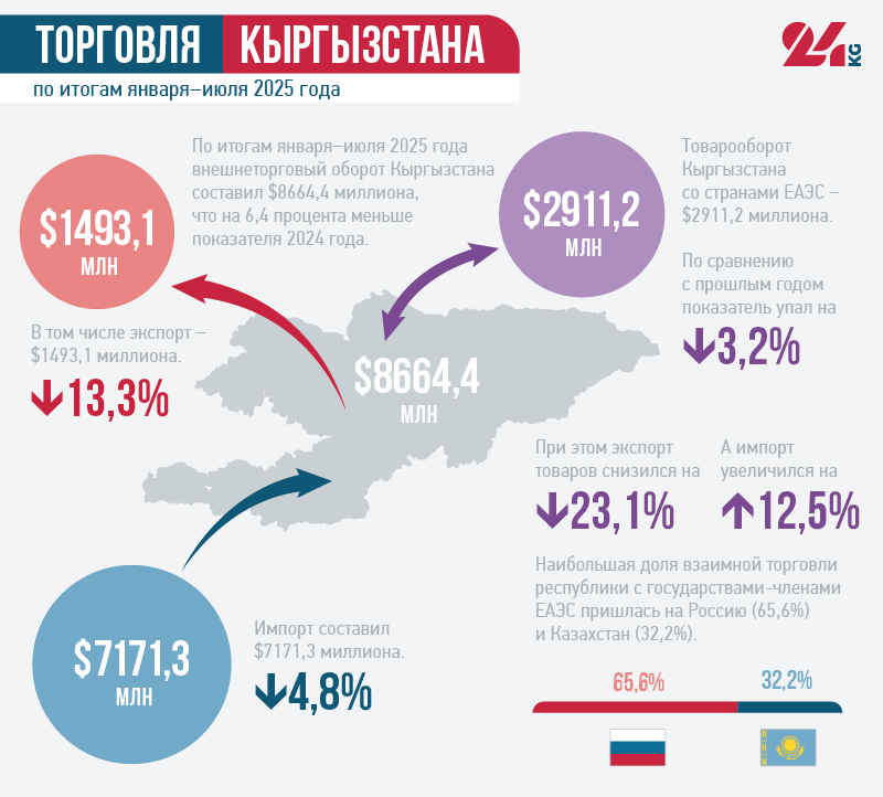 Объем внешней торговли Кыргызстана в январе — июле 2025 года составил $8 миллиардов 664,4 миллиона и по сравнению январем — июлем 2024-го уменьшился на 6,4 процента. По итогам января — июня падение составляло 12,4 процента. Об этом сообщил Национальный статистический комитет КР.