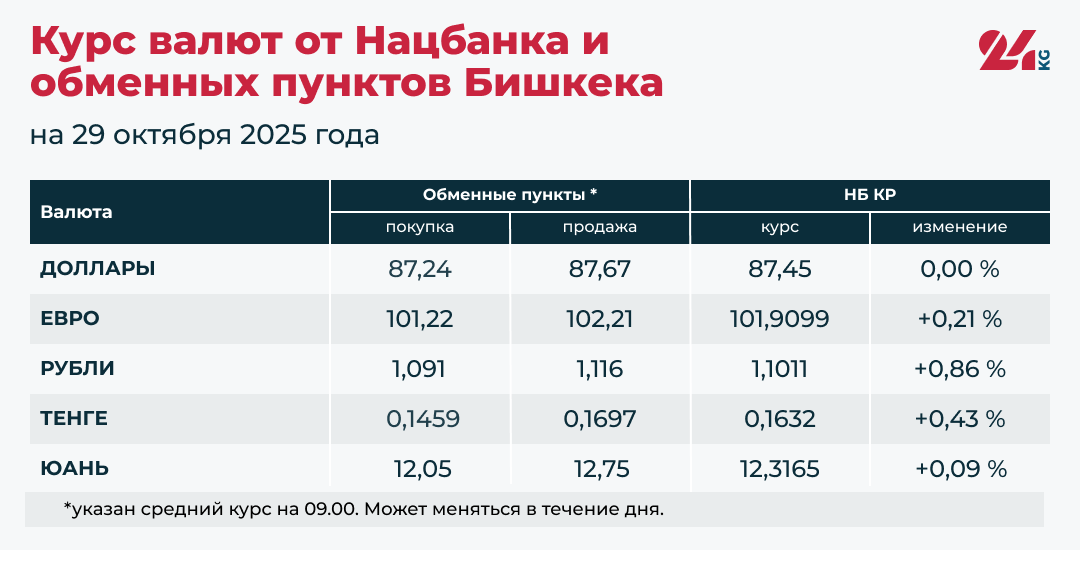 - Средний курс в обменных пунктах: покупка — 87,24 сома, продажа — 87,67 сома.