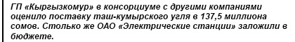 Компании, подавшие заявку на поставку таш-кумырского угля для ТЭЦ Бишкека, не добывают его. К такому заключению пришли специалисты ОАО «Электрические станции», посетившие угольный разрез.