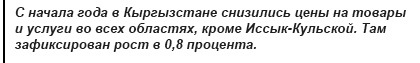 Продукты и безалкогольные напитки подешевели еще больше – на 1,8 процента. При этом услуги стали дороже на 1 процент, алкоголь и сигареты – на 0,6 процента, непродовольственные товары – на 0,3 процента. Непродовольственные товары больше всего подорожали в Чуйской области – на 6,4 процента.