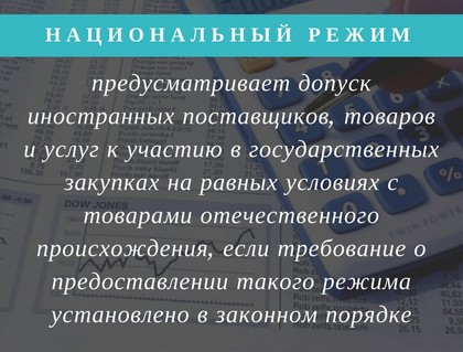 В новом законе расширяется и понятие национального режима. При закупке товаров из-за рубежа иностранные поставщики участвуют на таких же условиях, что и отечественные. В целях защиты конституционного строя, обеспечения обороны и безопасности государства, защиты внутреннего рынка, развития экономики правительство может ввести запрет на допуск иностранных товаров.