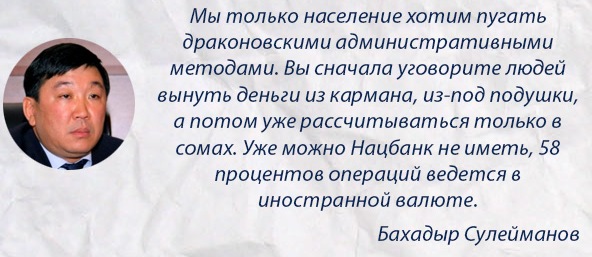 Документ разработали по поручению парламента. Однако именно депутаты первыми и раскритиковали его и даже не хотели принимать. Среди недовольных документом депутат Бахадыр Сулейманов. Он уверен, что 65 процентов валюты у населения на руках. Достаточно вернуть эти деньги в банковские учреждения, и ситуация изменится.