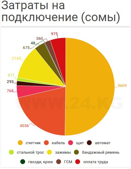 При подключении всех потребителей к трехфазному вводу на расстоянии не более ста метров от ближайшего питающего центра электроснабжающей организации абоненты должны заплатить фиксированную плату - 40 тысяч сомов, при этом энергокомпания выполняет работы «под ключ»: кабель плюс установка «умного» счетчика.