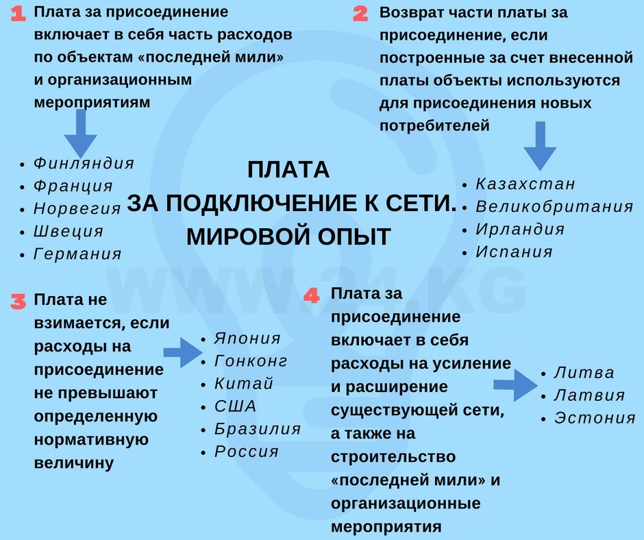 К примеру, в РФ с 1 октября 2017 года в плату за технологическое присоединение энергопринимающих устройств максимальной мощностью не более 150 кВт не включаются расходы, связанные со строительством объектов электросетевого хозяйства - от существующих объектов до присоединяемых энергопринимающих устройств.