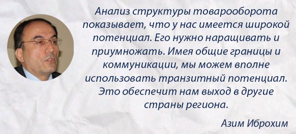 Для развития экономических связей Таджикистан считает перспективными направлениями гидроэнергетику, горнорудную, легкую, пищевую, химическую и перерабатывающую промышленность, туризм, агропромышленный комплекс. Азим Иброхим считает, что возможности в этом направлении недостаточно активно используются, хотя для этого имеются все условия.