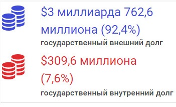 Соотношение госдолга к прогнозному ВВП за 2016 год составило 60,9 процента, а государственного внешнего долга к прогнозному ВВП – 56,3 процента. Таким образом, государственный долг КР составил 276 миллиардов 788,3 миллиона сомов ($4,072 миллиарда).