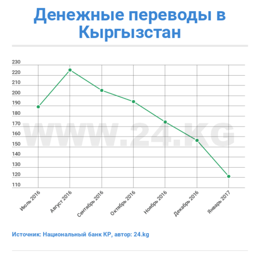 Отмечается, что по итогам первого месяца года в Кыргызстан переведено $121,4 миллиона. В декабре 2016 года эта сумма была несколько выше — $156,7 миллиона. При этом большая часть переводов приходится на Россию — $117,9 миллиона.