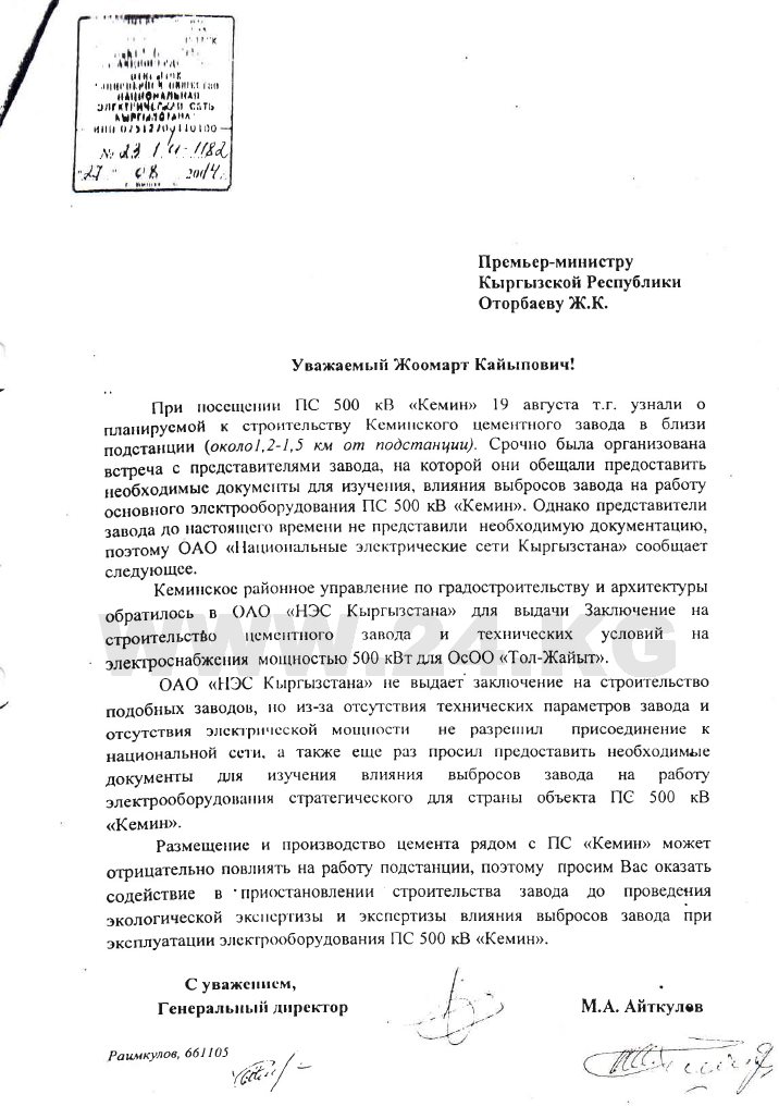 Уже тогда энергетики забили тревогу: нельзя возводить цементный завод рядом с высоковольтной подстанцией. В письме от 27 августа 2014 года гендиректор НЭСК Медетбек Айткулов рассказал премьер-министру Джоомарту Оторбаеву, что Кеминское районное управление по градостроительству и архитектуре обратилось в НЭСК для выдачи заключения о строительстве цементного завода и технических условий на электроснабжение в 500 кВ для… «Тол-Жайыт». Никакого «ЗЭТ «Цемент» тогда еще не существовало в проекте.