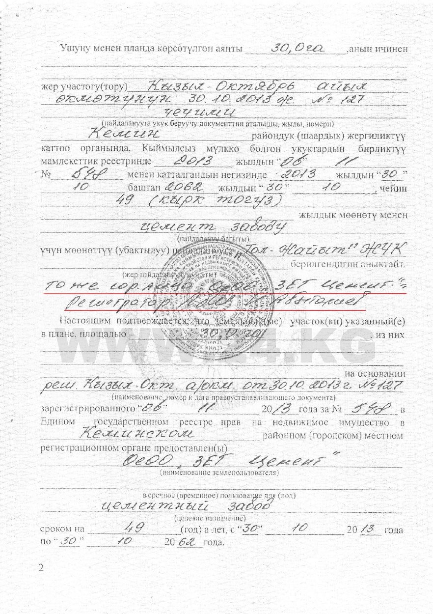 Интересен и сам факт выделения участка для строительства цементного завода. Изначально удостоверение на право временного пользования землей в Кеминском районе в 2013 году выдали ОсОО «Тол-Жайыт». Позже в акте сделали приписку, что это то же самое юридическое лицо — ОсОО «ЗЭТ «Цемент», которое и развернуло стройку у стратегического объекта.