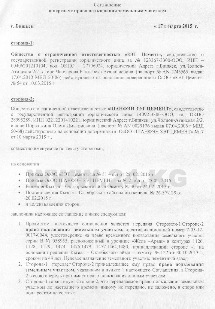 В марте 2015 года ЗЭТ «Цемент» передал право пользования землей своей же компании «Шанфэн ЗЭТ Цемент». Эта процедура документально подтверждена.