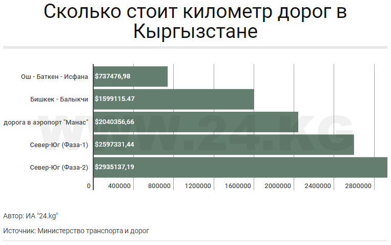 По информации экс-председателя Счетной палаты Эльмиры Ибраимовой, в Кыргызстане стоимость строительства одного километра варьируется от $0,7 до $3,1 миллиона.