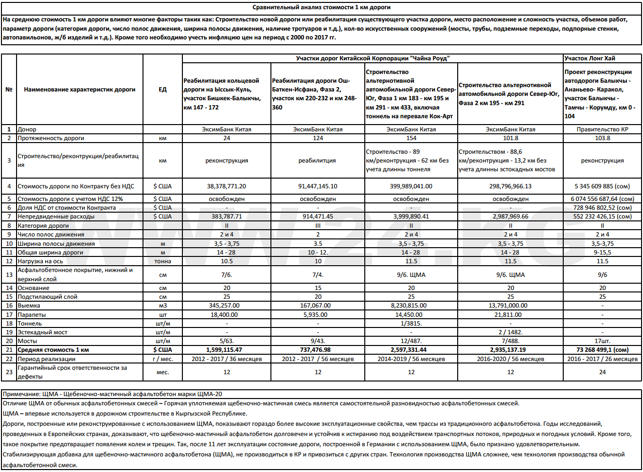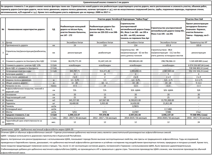 Минтранс предоставил ИА «24.kg» анализ дорожных проектов корпорации «Чайна Роуд энд Бридж» и «Лонг Хай», в котором расписаны и объемы работ, и стоимость за километр.