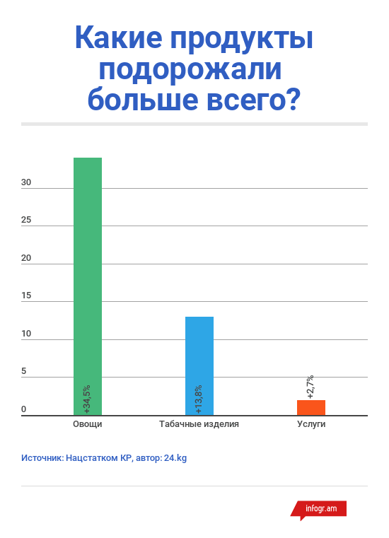 Максимальный рост цен зафиксирован в городе Ош — 3,9 процента. Там непродовольственные товары подорожали на 2,5 процента, а алкогольные напитки и табачные изделия — на 8 процентов.