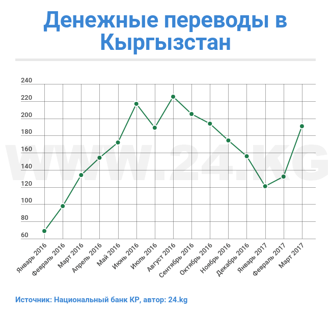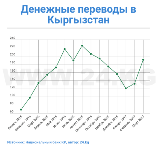 Отмечается, что основная часть переводов приходится на Россию. Оттуда перечислено $433,1 миллиона. В прошлом году цифра составляла $290,8 миллиона. Объем переводов обновил рекорд 2013 года, когда за первый квартал в страну перевели $411 миллионов сомов.
