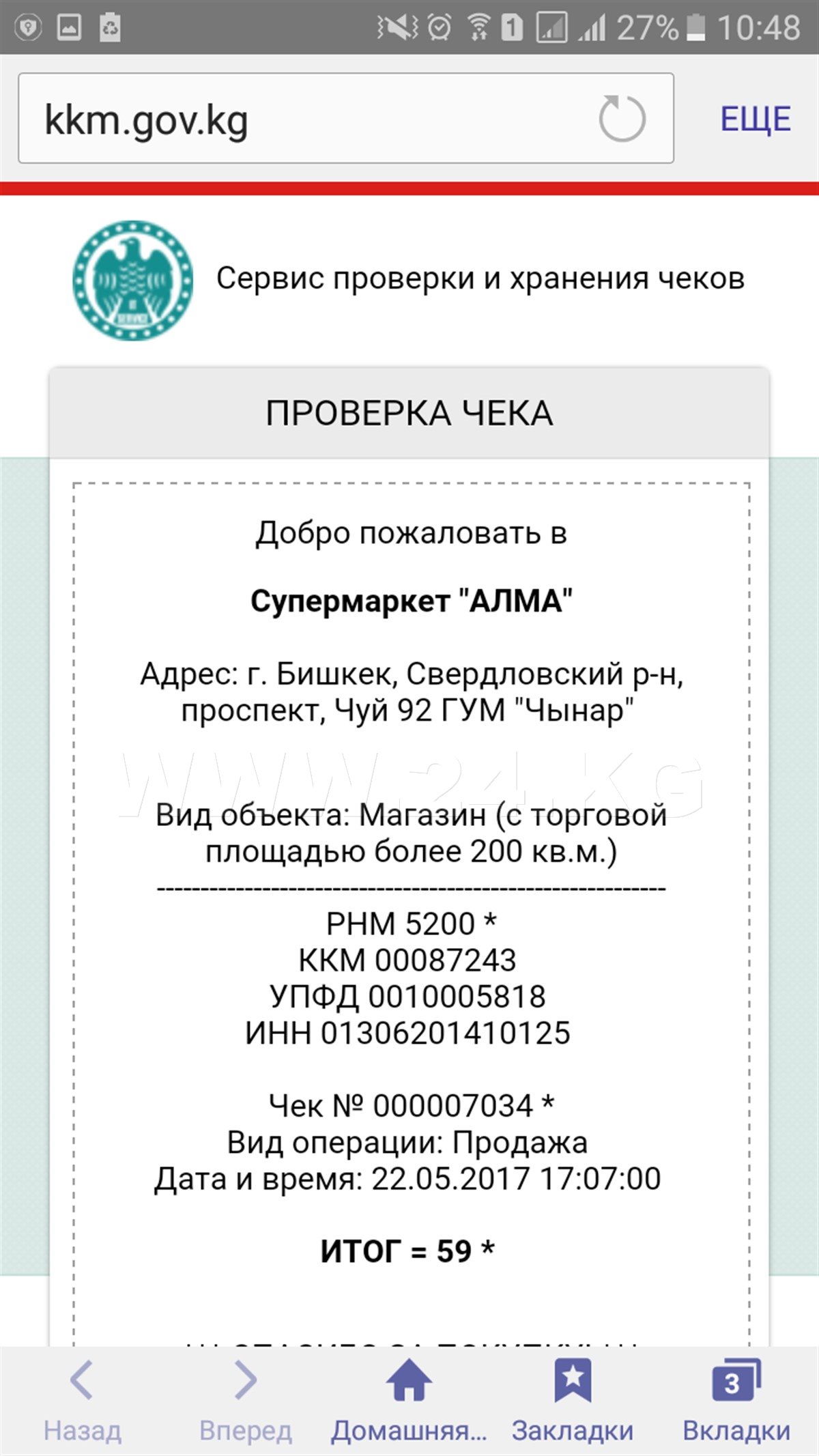 Чтобы проверить достоверность с компьютера, нужно зайти на сайт — www.kkm.gov.kg. В специальных полях следует пробить регистрационный номер контрольно-кассовой машины, номер чека и сумму, указанную на чеке. На этом же сайте можно проследить количество модернизированных (установленных) ККМ, количество и сумму выбитых чеков. Данные обновляются каждые 10 секунд.