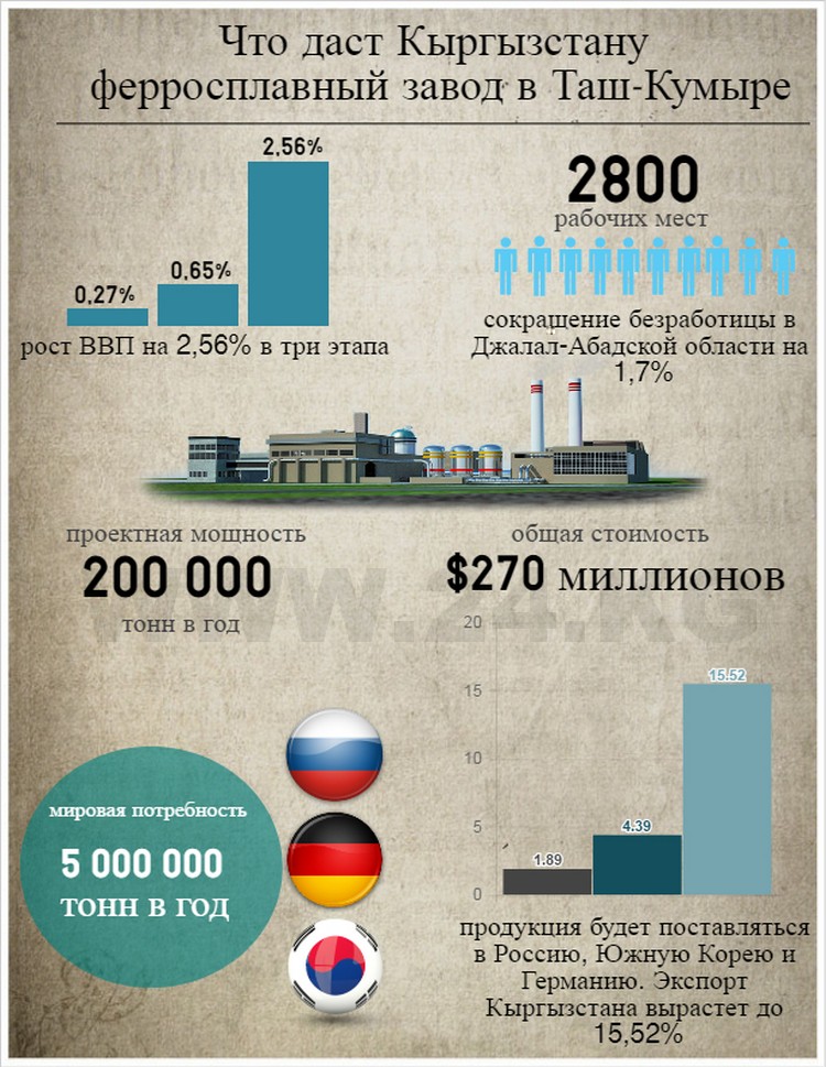 «Нам удалось решить вопрос о строительстве ферросплавного завода в городе Таш-Кумыре, — сообщил глава государства Алмазбек Атамбаев журналистам, подводя итоги визита в Республику Корея, которую он посетил с официальным визитом в 2013 году. — Им займется компания Posco. Надеемся, что скоро завод заработает. С руководством корейского банка «Эксим» мы провели переговоры».