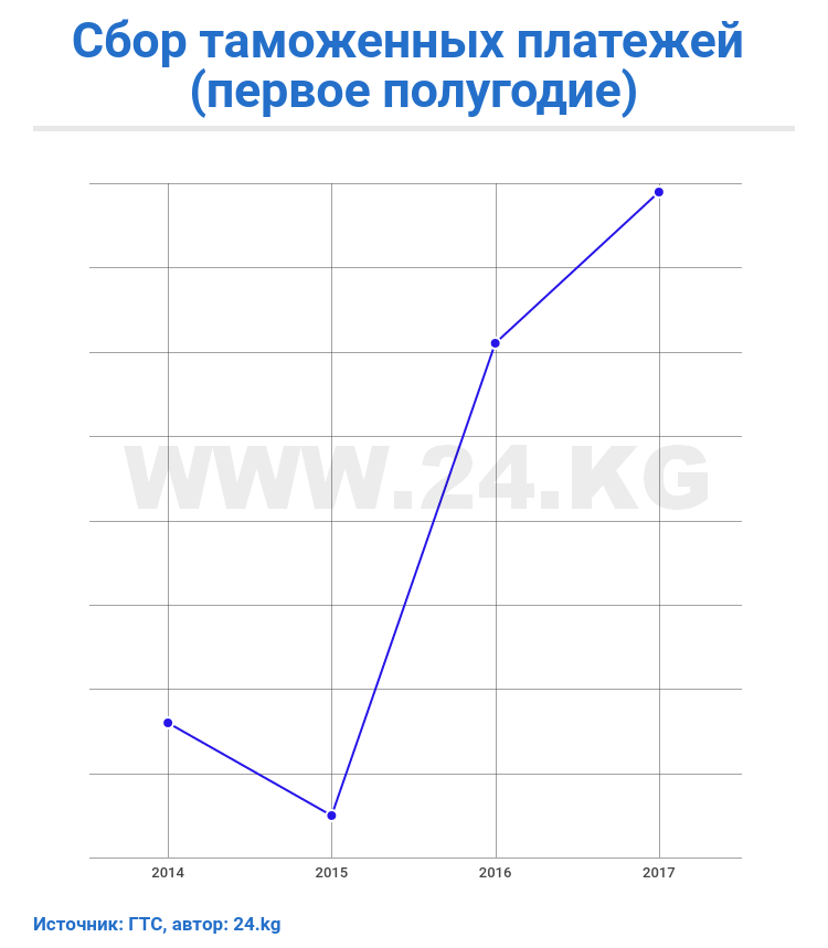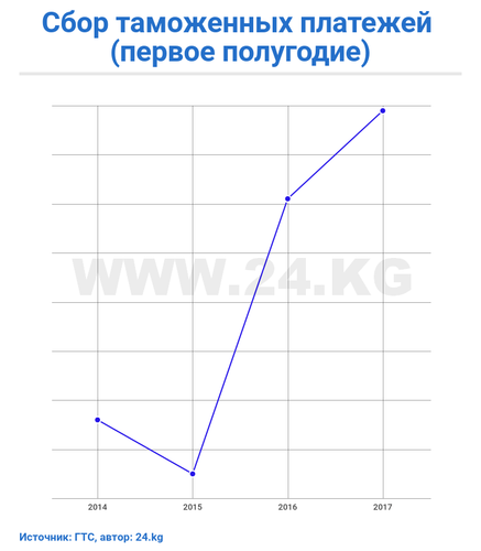 Отмечается, что по сравнению с установленным планом сборы выросли на 1,8 процента, или на 261,4 миллиона сомов больше. По сравнению с первым полугодием 2016 года поступление таможенных платежей увеличилось на 1,8 миллиарда сомов, или на 14,1 процента.