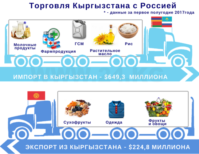 Внешнеторговый оборот Кыргызстана по итогам пяти месяцев 2017 года составил $2,3 миллиарда сомов. По сравнению с прошлым годом он вырос на 15,8 процента, а вот по сравнению с 2015 годом наблюдается падение на 13,5 процента. При этом экспорт вырос на 30 процентов, а импорт — на 10,9 процента.
