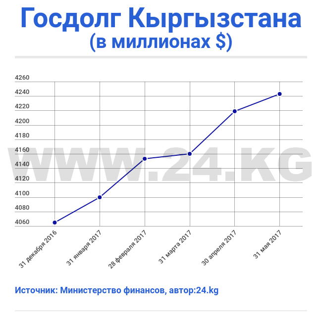 Отмечается, что по состоянию на 31 мая 2017 года размер государственного долга сложился в сумме $4 миллиарда 243 миллиона 52 тысячи, или 288 миллиардов 768 миллионов 47 тысяч сомов.