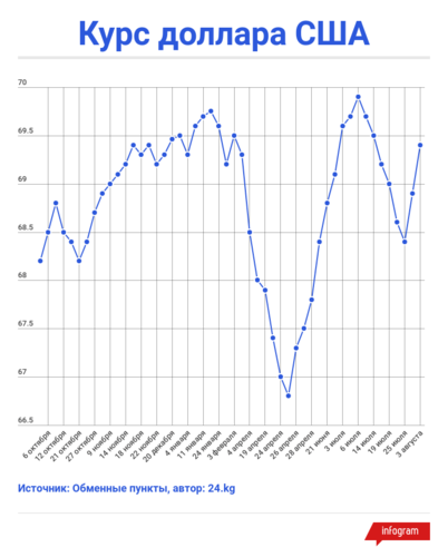 Сегодня обменные пункты столицы и коммерческие банки покупают доллар по 68,9-69,2 сома, а продают — по 69,3-69,5 сома. Номинальный курс установлен в 68,6875 сома.