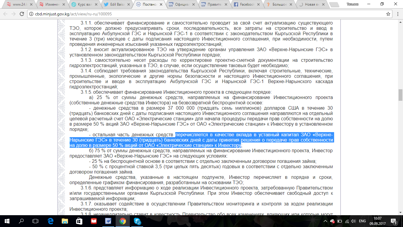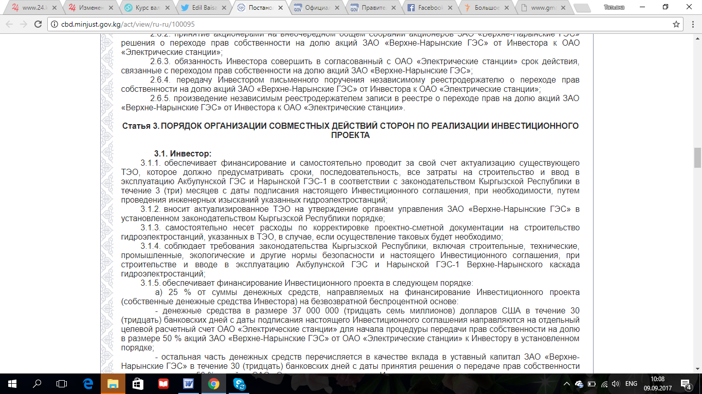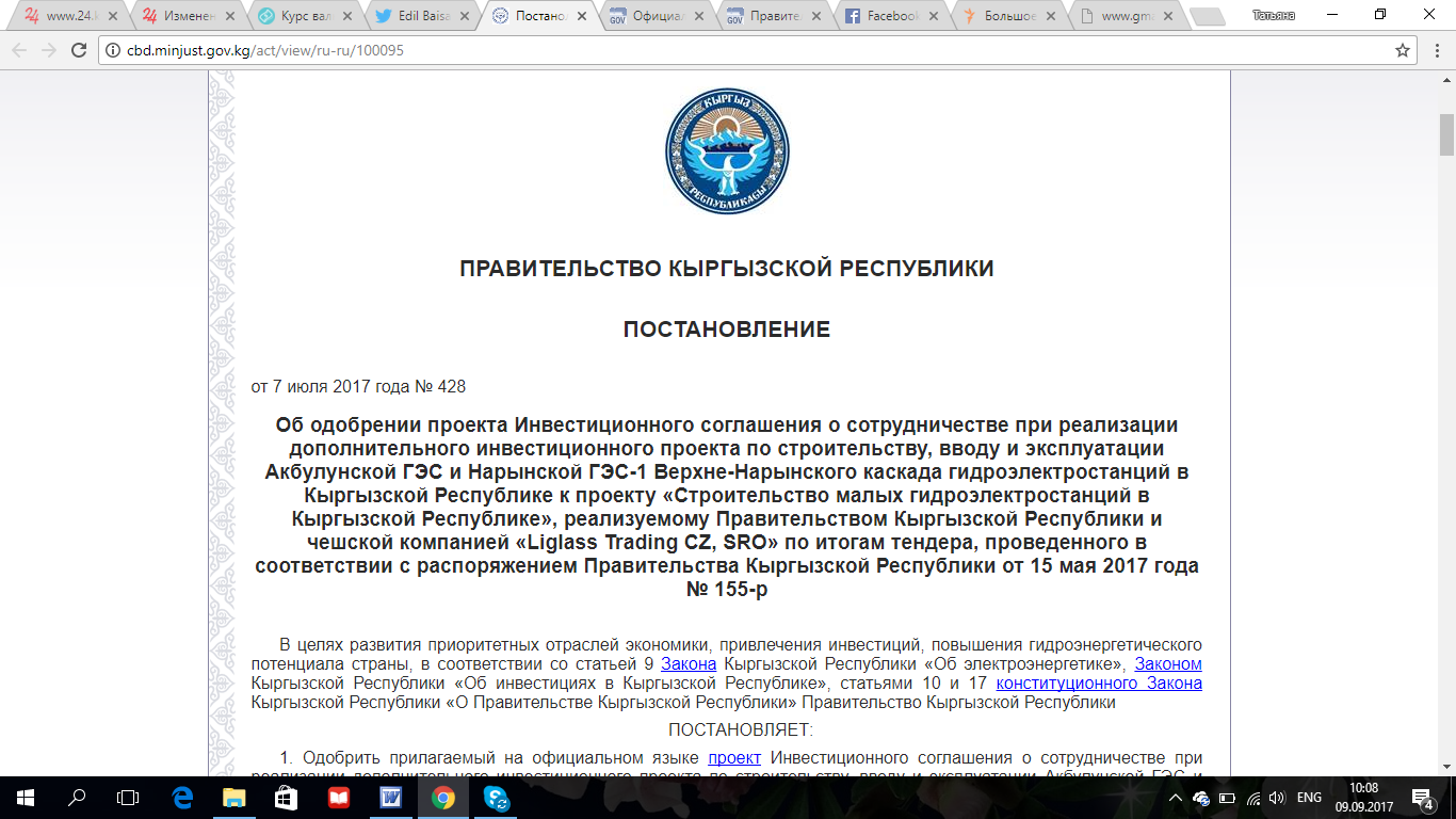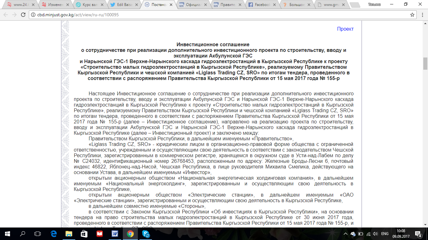 В постановлении также есть текст инвестиционного соглашения о сотрудничестве при реализации дополнительного инвестиционного проекта по строительству, вводу и эксплуатации Акбулунской ГЭС и Нарынской ГЭС-1 к проекту «Строительство малых гидроэлектростанций в Кыргызской Республике», реализуемому правительством КР и чешской компанией Liglass Trading CZ, SRO по итогам тендера, проведенного в соответствии с распоряжением правительства КР от 15 мая 2017 года за № 155-р.В инвестиционном соглашении четко указано, что денежные средства в размере $37 миллионов в течение 30 банковских дней с даты подписания инвестиционного соглашения направляются на отдельный целевой расчетный счет ОАО «Электрические станции» для начала процедуры передачи прав собственности на долю в размере 50 процентов акций ЗАО «Верхненарынские ГЭС» от ОАО «Электрические станции» к инвестору в установленном порядке.