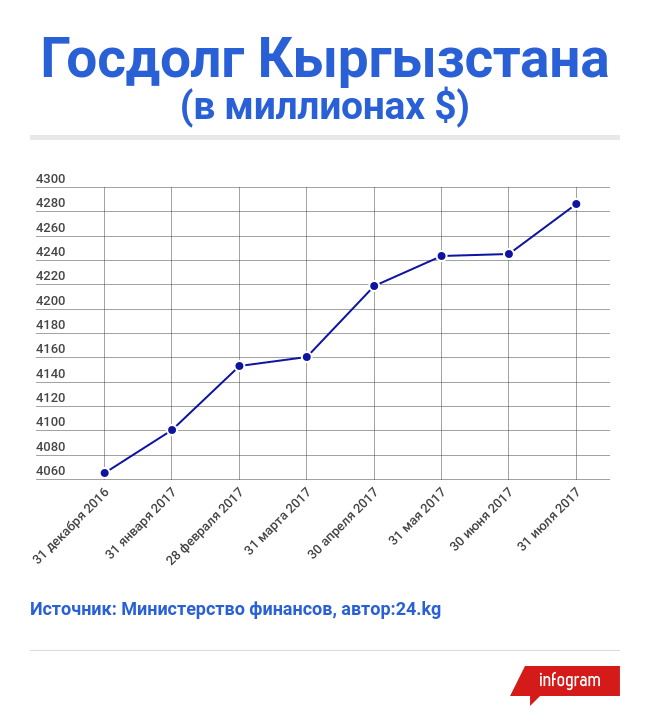 Отмечается, что на 31 июля 2017 года размер государственного долга составил $4 миллиарда 286 миллионов, или 294 миллиарда 238 миллионов сомов. Из них $3 миллиарда 897 миллионов 27 тысяч — внешний долг, а $388 миллионов 80 тысяч — внутренний долг.