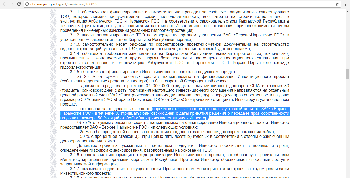Однако недавно на сайте Министерства юстиции появилось постановление правительства о контракте с Liglass Trading. В нем есть и само инвестиционное соглашение. В этом документе указано, что 25 процентов от общей суммы контракта являются безвозмездным вкладом Liglass Trading в проект строительства Верхненарынского каскада ГЭС. При этом первые $37 миллионов из этой суммы перечисляются в течение 30 банковских дней после подписания соглашения. А оставшуюся часть чешская компания вносит после одобрения сделки по передаче 50 процентов акций ЗАО «Верхненарынские ГЭС» Liglass Trading.