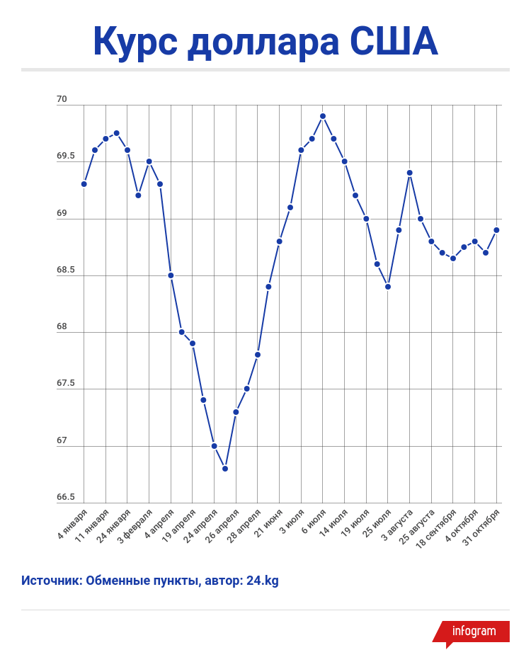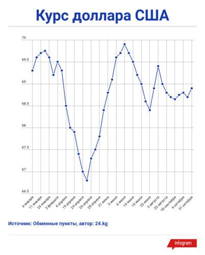 Сегодня обменные пункты столицы и коммерческие банки покупают американскую валюту по 68,6-68,7 сома, а продают по 68,9-68,95. Номинальный курс, установленный Национальным банком Кыргызстана: 68,72 сома (рост за сутки — 0,03 процента).