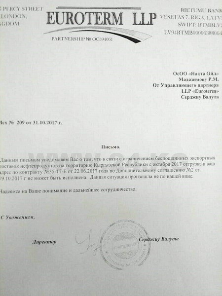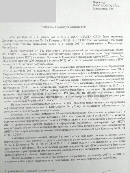 Кроме того, в октябре Кыргызстан выбрал утвержденный лимит беспошлинных поставок дизтоплива. Он был утвержден в объеме 490 тысяч тонн. В распоряжении ИА «24.kg» оказалось письмо, в котором говорится, что Федеральная таможенная служба России приостановила декларирование нефтепродуктов, направляющихся в Кыргызстан.