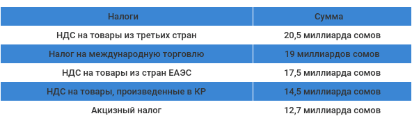 Самые значительные поступления ожидаются от уплаты налога на добавленную стоимость — 52,5 миллиона сомов. А меньше всего планируется получить от акциза на товары, ввозимые в Кыргызстан из третьих стран (255,7 миллиона), патентов (318,2 миллиона), налога на транспорт (797,5 миллиона) и недвижимое имущество (804,5 миллиона сомов).
