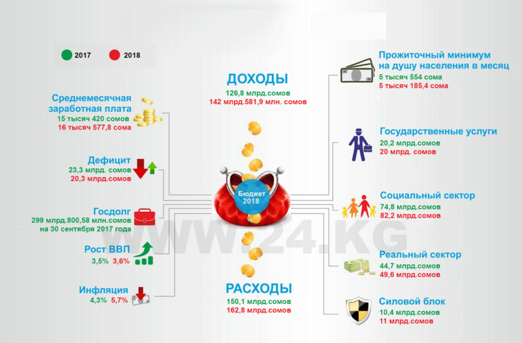 Министерство финансов внесло на рассмотрение парламента бюджет республики на 2018 год. Новшеств в проекте нет. Расходы традиционно растут, а большую часть средств потратят на социальную сферу. ИА «24.kg» изучило документ и представляет его основные параметры.