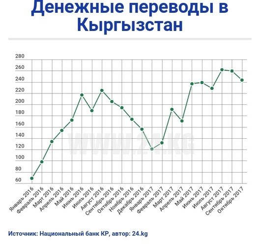 Основная часть средств поступила из России — $238,8 миллиона. При этом из Кыргызстана в другие страны в октябре отправлено $47,1 миллиона. Таким образом, чистый приток переводов в страну в октябре составил $196 миллионов.