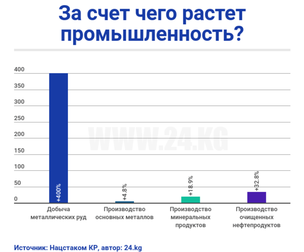По росту промышленности Кыргызстан на первом месте среди стран Евразийского экономического союза. Но тут вновь прослеживается ориентация экономики на горнорудный сектор. Самые большие успехи демонстрировали отрасли, так или иначе связанные с полезными ископаемыми. В разы выросли объемы добычи металлических руд. Показатель держится на рекордно высоком уровне весь год.