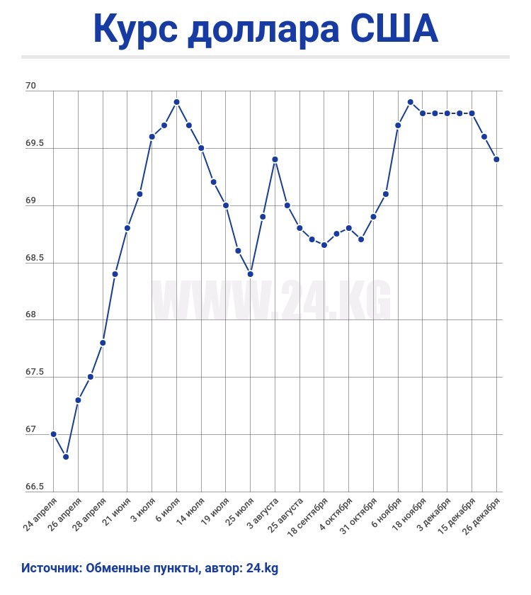 Сегодня обменные пункты столицы и коммерческие банки покупают доллар по 69,1-69,2 сома, а продают по 69,4-69,5. Номинальный курс — 69,4318 сома (падение за сутки — 0,02 процента).