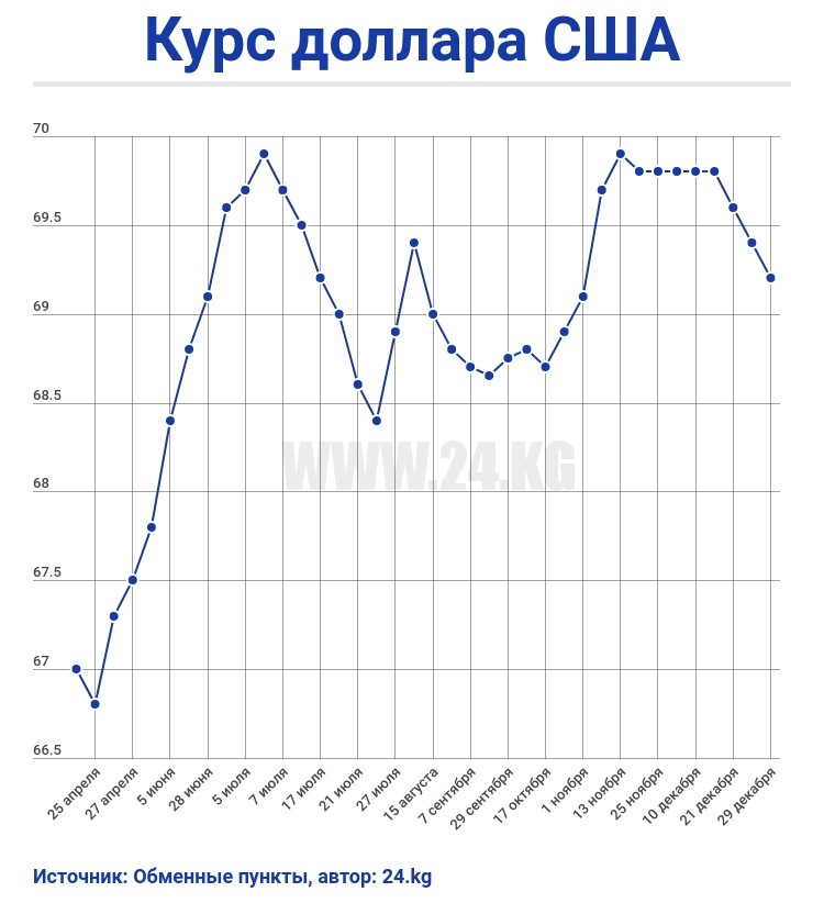 За неделю доллар в Кыргызстане подешевел еще на 20 тыйынов. Курс покупки «американца» опустился ниже 69 сомов.