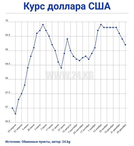 Сегодня обменные пункты столицы и коммерческие банки покупают доллар по 68,5-68,9, а продают по 69,15-69,2 сома. Номинальный курс – 69,14 сома (падение за сутки – 0,23 процента).
