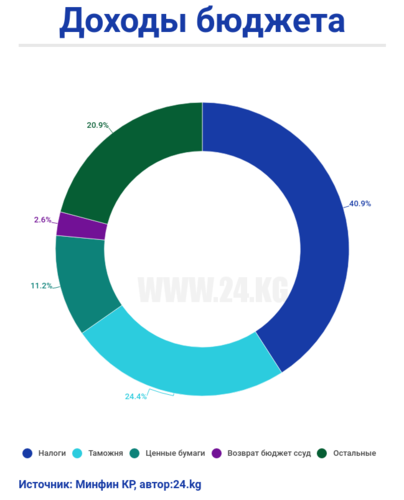Основную часть доходов составляют налоговые поступления — 91 миллиард 462,8 миллиона сомов. Это на 9 миллиардов 977,1 миллиона больше, чем в 2016 году. При этом от уплаты налогов и сборов бюджет пополнился на 57 миллиардов 282,9 миллиона сомов, от таможенных сборов — на 34 миллиарда 179,9 миллиона сомов.