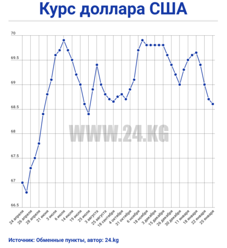 Сегодня обменные пункты столицы и коммерческие банки покупают доллар по 68,2-68,3 сома, а продают — по 68,5-68,65 сома. Номинальный курс — 68,407 сома (падение за сутки — на 0,42 процента).