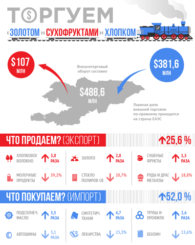 По итогам января объем внешнеторгового оборота Кыргызстана достиг $488,6 миллиона. Экспорт составил $107 миллионов, импорт — $381,6 миллиона. Львиная доля внешней торговли по-прежнему приходится на страны ЕАЭС.