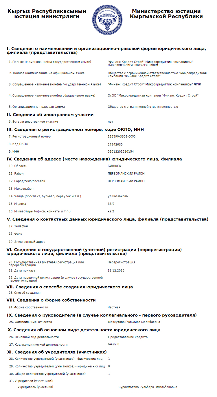 По данным Министерства юстиции, руководителем ОсОО МКК «Финанс Кредит Строй» является Максутова Гульмира Мелибаевна. Учредителем числится Суракматова Гульбара Эмильбековна. Компания прошла перерегистрацию 11 декабря 2015 года. Гульбара Суракматова — сестра единственного кандидата в мэры Бишкека Азиза Суракматова.