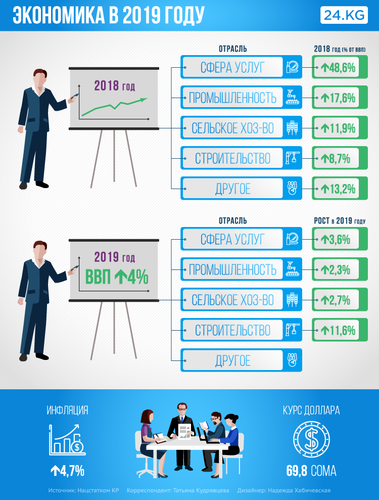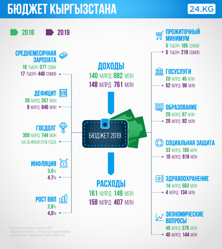 В 2019 году объем ВВП на душу населения составит $1 тысячу 399,8. Среднемесячная заработная плата — 17 тысяч 440,7 сома, а прожиточный минимум — 5 тысяч 219,2 сома.