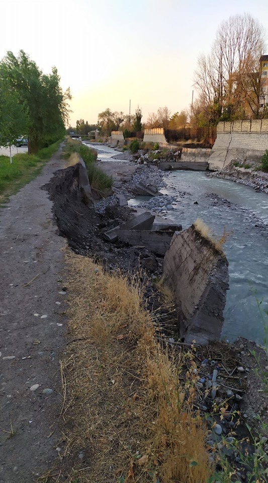Bank of Ala-Archa river collapses along Bakayev Street (above Leo Tolstoy Street) in Bishkek. Photos were posted on Facebook.