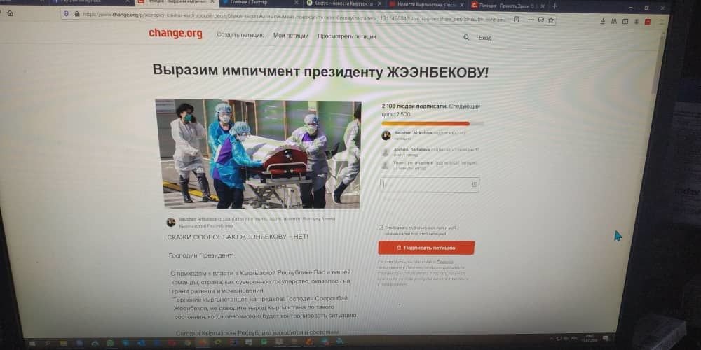 Change.org is a popular platform. Kyrgyzstanis have been actively creating petitions there. The website announced collection of signatures against the bill of Gulshat Asylbaeva on Manipulating Information. There were initiatives in defense of doctors, for abolition of online exams and others.