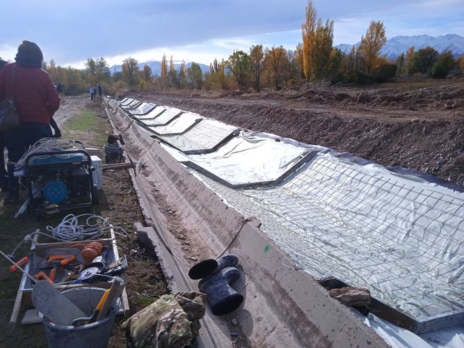 The main purpose of modernizing the canal is to increase the efficiency of the facility. Before the repair, it was losing colossal volumes of water. After the modernization, its efficiency should reach 90 percent. Inefficient operation of the canal is not only a technical problem. Residents of Iskra village said that problems with access to water created conflicts on ethnic grounds. The fact is that historically the majority of Iskra’s population is Dungan people, while the residents of the surrounding settlements are Kyrgyz. Neighbors often had to quarrel over water. Now this problem will be solved — once the modernization of the canal is completed, there should be enough water for everyone. The most important technical task that the builders are now solving is to minimize water losses during transportation. For this purpose, the contractors are using several elegant technical solutions.Before concreting the canal, the bottom of the object is laid out with a special fabric. A layer of waterproofing film is laid on top. It is also covered with a cloth (to prevent the concrete from slipping). Then reinforcement, which includes basalt, is installed on these three layers. It is stronger and more durable than the usual steel reinforcement.