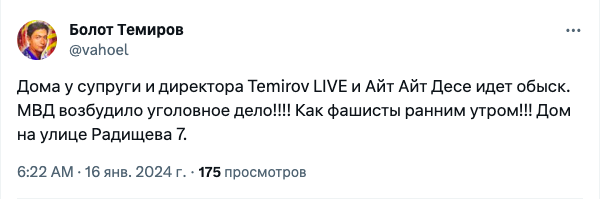 The house of the director of Temirov Live and the wife of investigative journalist Bolot Temirov, Makhabat Tazhibek kyzy, is being searched. The journalist posted on X (Twitter).