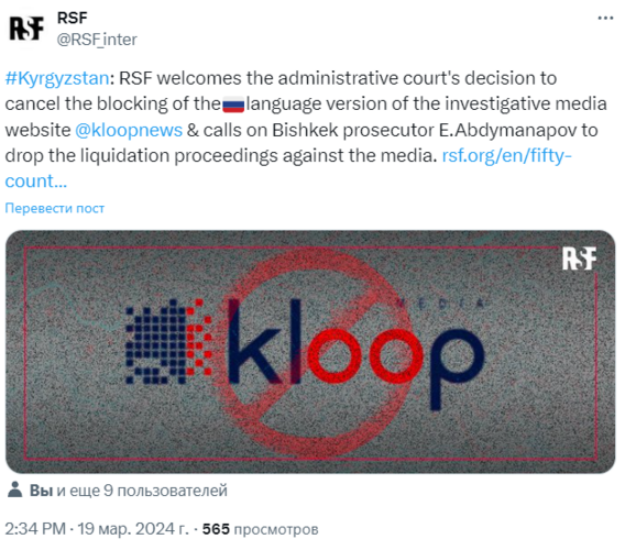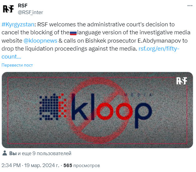The international organization Reporters Without Borders (RSF) welcomes the Administrative Court’s decision to cancel the blocking of the Russian language version of the investigative media website Kloop. The statement was posted on X.