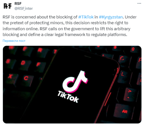 The international organization Reporters Without Borders (RSF) is concerned about the blocking of TikTok in Kyrgyzstan. The organization’s statement was posted on X social media.