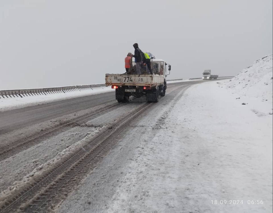 Snow fell on Too-Ashuu pass on Bishkek — Osh highway. The press service of Kyrgyzavtozhol-Sever state enterprise under the Ministry of Transport of Kyrgyzstan reported.