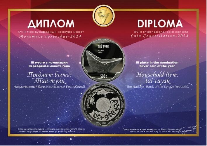 The collectible silver coin Tai Tuyak from the «Historical Events» series took the third place at the XVIII international coin competition Coin Constellation — 2024 in the nomination «Silver Coin of the Year», the National Bank of Kyrgyzstan reports.